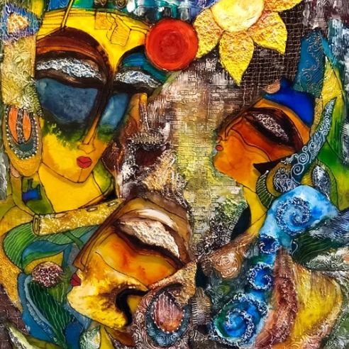Growing up in Bangladesh played a significant role in shaping Mity’s imaginative mind for artwork. The vibrant colors, bustling streets, and cultural diversity of the city inspired her to explore different colors, patterns, and textures. Mity’s exposure to a wide range of perspectives and artistic styles in Bangalore allowed her to create artwork that presents a unique fusion of different cultural elements and techniques, using glass as her canvas to capture the vibrancy of both Bangladesh and India. Mity employs glass and ceramic tiles as her canvas and uses various mediums such as alcohol ink, acrylic, oil pastels, water-based colors, modeling paste, fabrics, and natural elements to create textures and experiment on different levels. She visualizes the colors on her canvas flowing like ragas of classical music, her patterns, lines and shapes moving in rhythms. Mity’s canvas is not any less of a musical instrument. Optimism manifests in her work, symbolizing love, light, and the power of nature and humans.