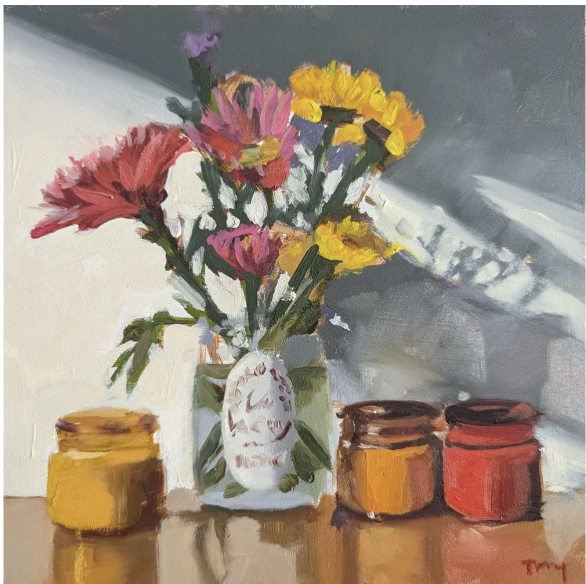Tracey lives and paints in Edmonds, Washington. Her work explores quiet, intimate moments through simplified still life compositions. She is drawn to everyday objects—glass, fruit, bottles—not for their function, but for the way they hold light, color, and mood. In these familiar forms, she looks for something more atmospheric and emotional than literal.