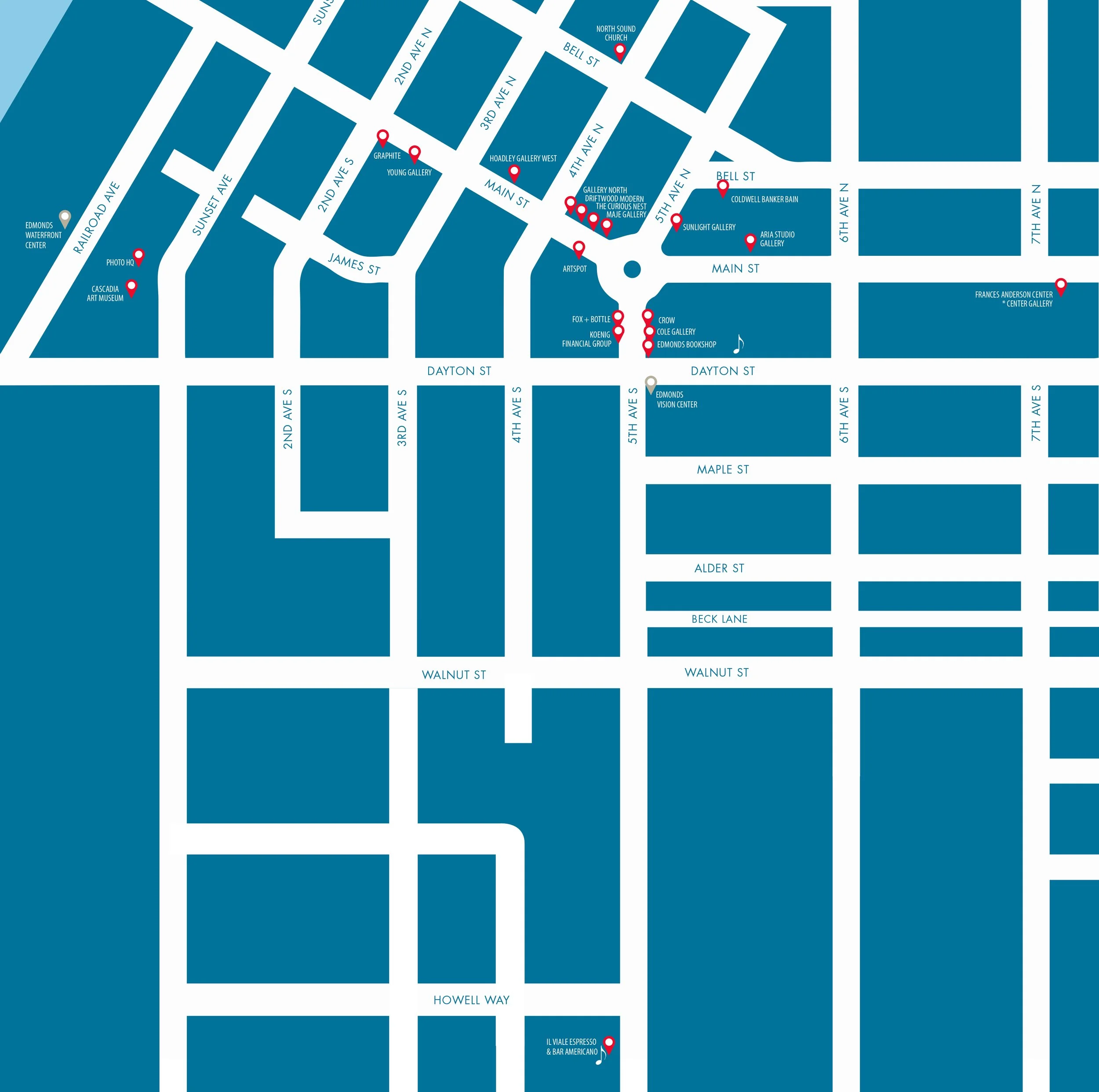 Locations in red are open during Third Thursday Art Walk from 5-8pm on February 19th. Click the map image for a printable map.