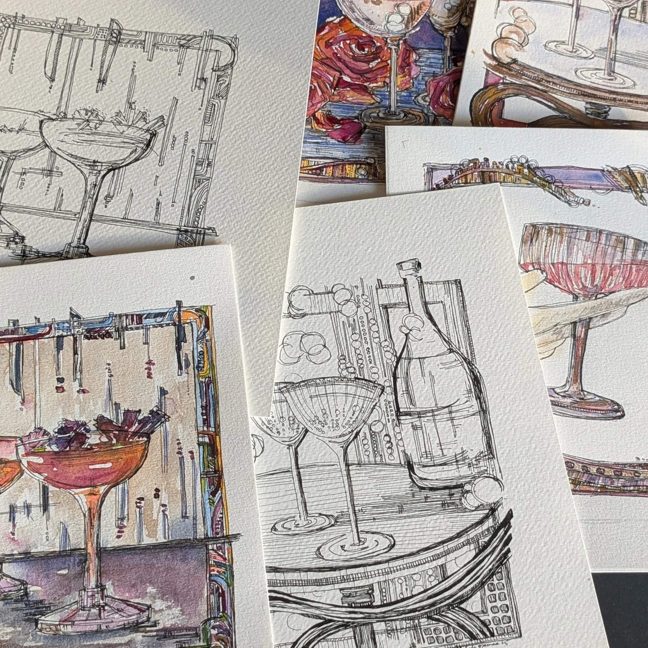 “Celebration Series”- this series of pen and watercolor artwork was first inspired by gathering around festive tables and printing “celebration cards” leading into the holidays. Moving on from festive tables, the images in Celebration Series displayed are inspired by “raising a glass”- which you can do at Fox and Bottle while taking in the pieces. Make sure to grab a free postcard featuring the artwork—send it to a friend and invite them to raise a glass with you!