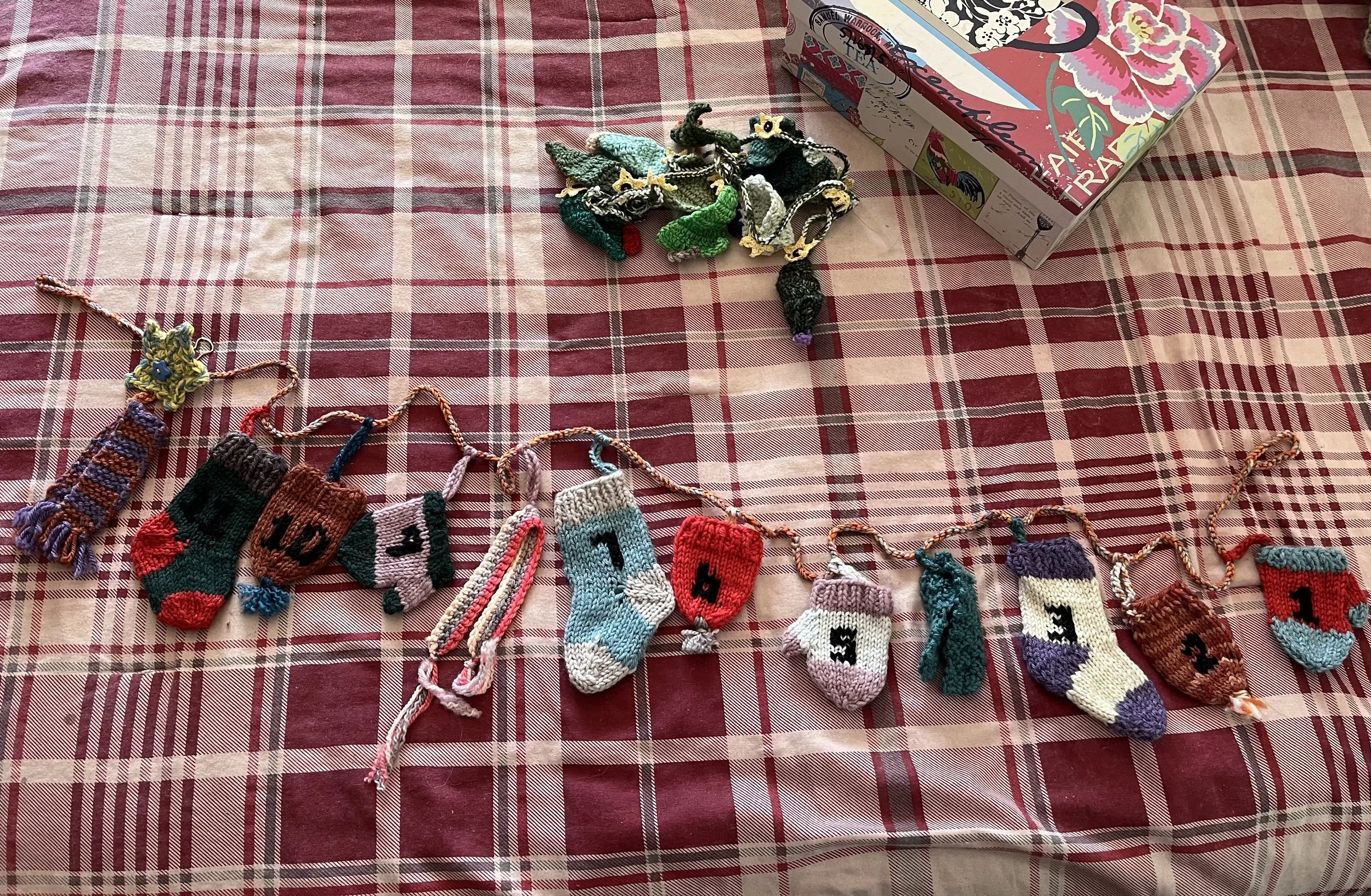 Bethany, of Sethanyknits, is a local Fiber Artist who has been using yarn as her medium for creative expression for over 30 years. This collection combines hand knit and crocheted items in sets of 12 so you can count down for the last 12 days towards the Holiday you celebrate! Also, displayed are eclectic holiday decorations inspired by a variety of patterns and crafted by Bethany.