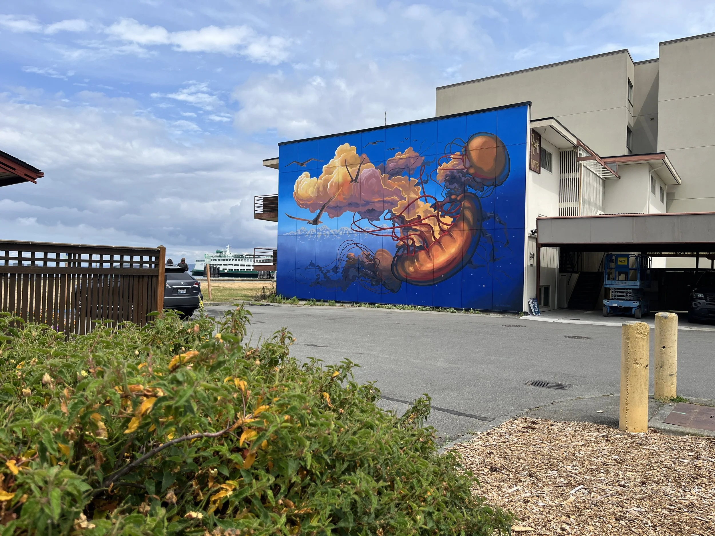 Painted by muralist Will Schlough, “Drift” transforms the south-facing wall of the Reef Apartments (250 Beach Place) into a breathtaking surrealist landscape. A Pacific sea nettle jellyfish rises gracefully from the depths, its oral arms echoing the form of drifting clouds as they blend into a vivid Olympic Peninsula sunset.